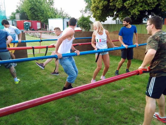 Vy a vaši přátelé budete během zápasu přivázáni k vodorovným tyčím, čímž se sami stanete figurkami ve hře. A ano, je to ještě těžší, než to vypadá. Ale pivo na uvítanou, které je na nás, vás dostane do té správné nálady a formy!